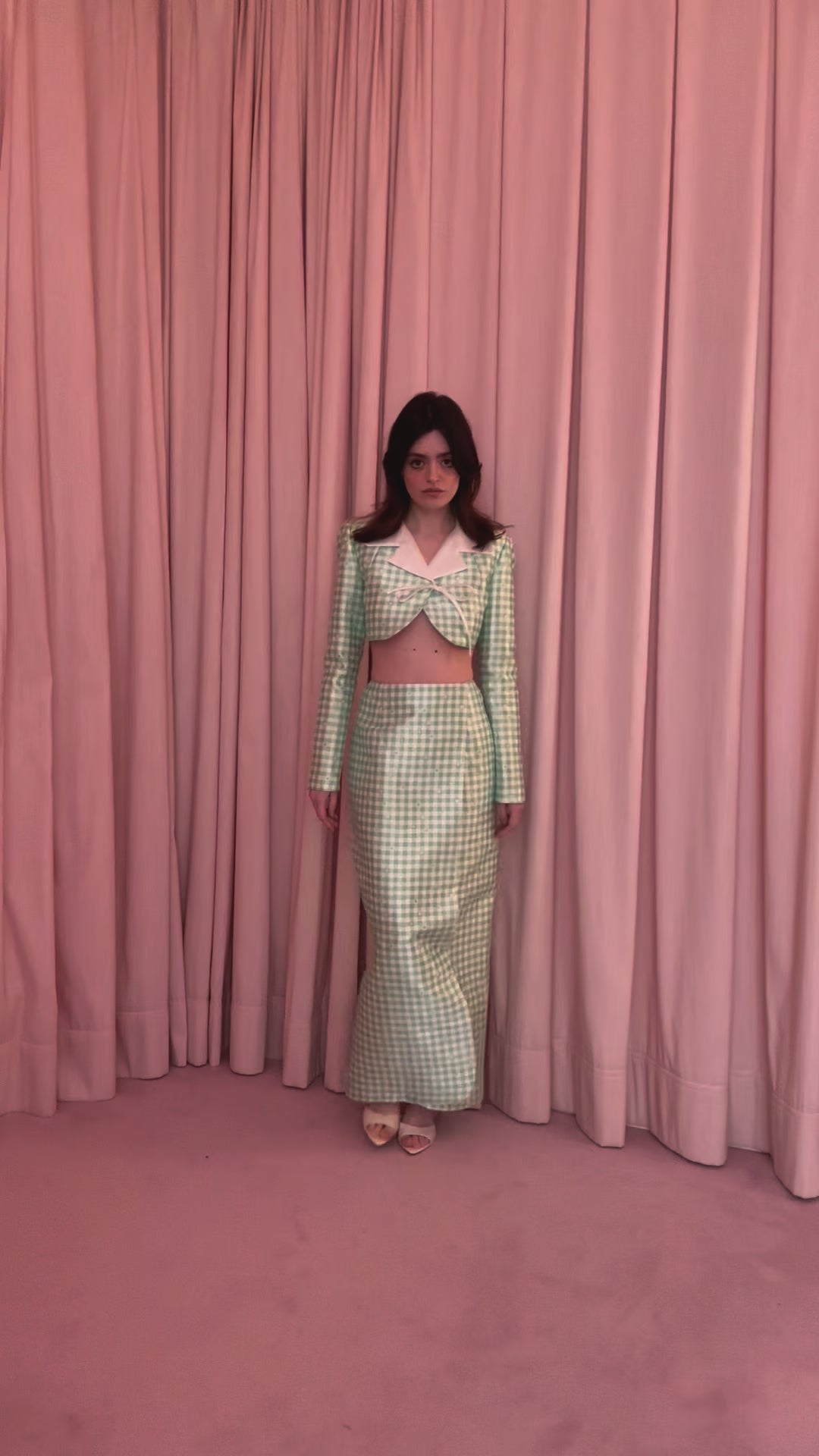 Falda pareo en mikado estampado en vichy verde con flores. Cierre con ganchos internos. Largo a tobillo.